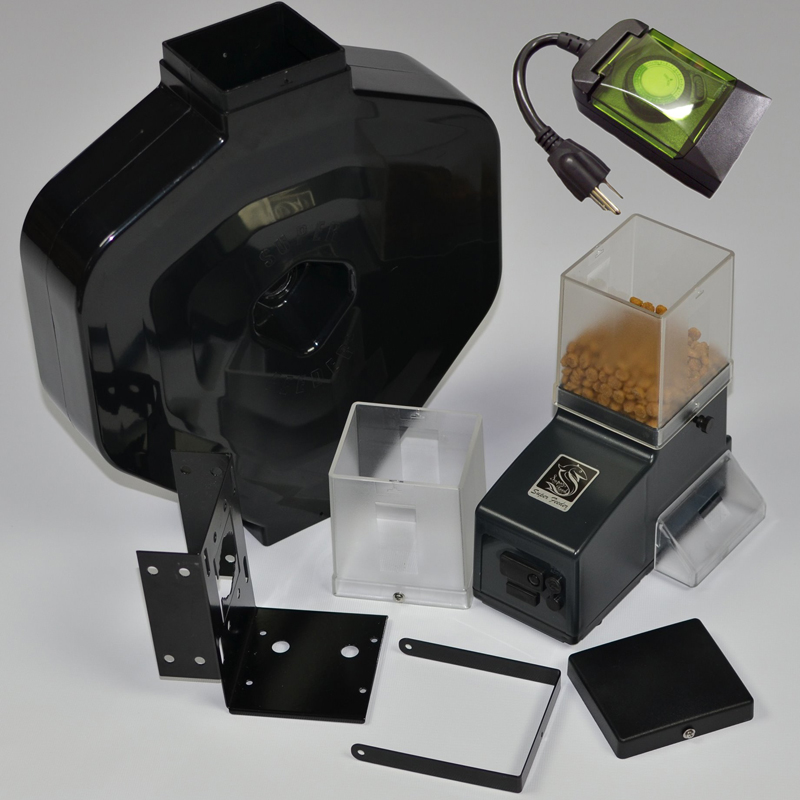 When mounting this feeder outdoors, make sure you protect the chute opening from animals like raccoons with a guttering system or enclosing the feeder appropriately. CHUTE COVER IMPORTANT NOTE: EVEN THOUGH THE CHUTE COVER WILL PROTECT THE CHUTE OPENING FROM THE OUTDOOR ELEMENTS, IT WILL NOT PROTECT INTRUSION BY LARGE ANIMALS, PARTICULARLY RACCOONS WHO COULD RIP IT OFF EVEN POSSIBLY RESULTING IN FEEDER HOUSING DAMAGE. THE CHUTE AREA SHOULD BE ADEQUATELY PROTECTED BY AN EXTERNAL DEVICE OR THE FEEDER INSTALLED IN AN ENCLOSURE OF SOME TYPE AS SHOWN THROUGHOUT OUR WEBSITES WITH PAST CUSTOMER PICTURES. If indoors, you may consider a combo with fitted plastic stand/bowl and timer.