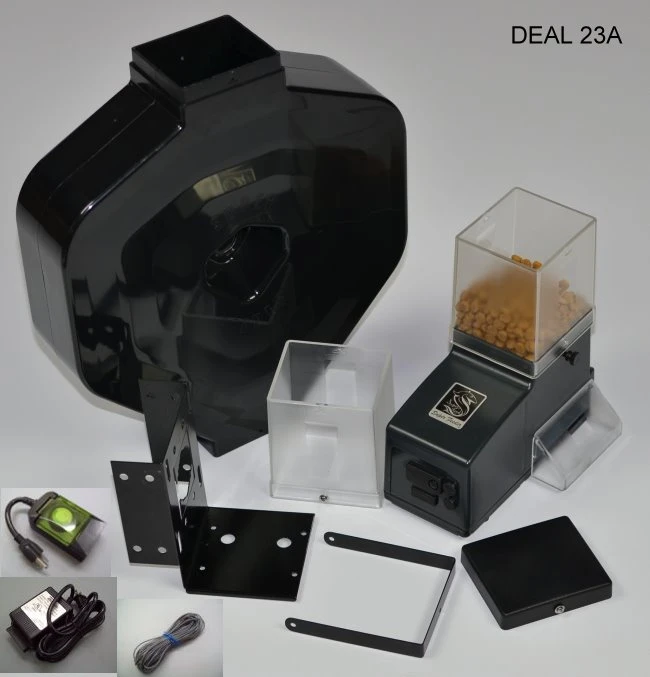 When mounting this feeder outdoors, make sure you protect the chute opening from animals like raccoons with a guttering system or enclosing the feeder appropriately. CHUTE COVER IMPORTANT NOTE: EVEN THOUGH THE CHUTE COVER WILL PROTECT THE CHUTE OPENING FROM THE OUTDOOR ELEMENTS, IT WILL NOT PROTECT INTRUSION BY LARGE ANIMALS, PARTICULARLY RACCOONS WHO COULD RIP IT OFF EVEN POSSIBLY RESULTING IN FEEDER HOUSING DAMAGE. THE CHUTE AREA SHOULD BE ADEQUATELY PROTECTED BY AN EXTERNAL DEVICE OR THE FEEDER INSTALLED IN AN ENCLOSURE OF SOME TYPE AS SHOWN THROUGHOUT OUR WEBSITES WITH PAST CUSTOMER PICTURES. If indoors, you may consider a combo with fitted plastic stand/bowl and timer.