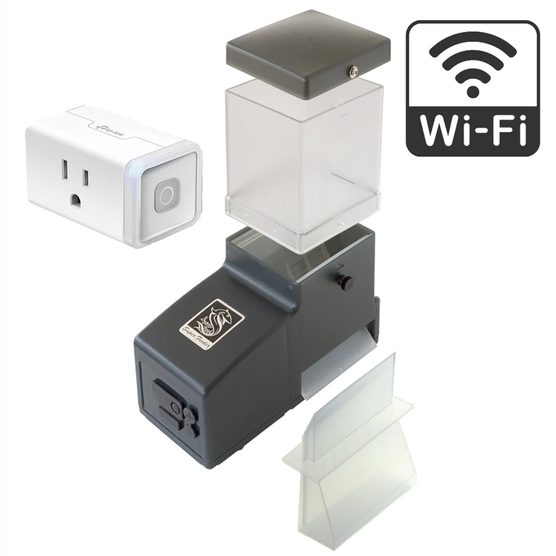 Free shipping on all Super Feeders and tax free except to TN.  Are you tired of cheap aquarium feeders you mount on the side of an aquarium glass that only work for a few days, clump up and quit? This bundle includes the TP Link HS-103 Wi-Fi mini plug, which is one of a several best Wi-Fi Smart Plugs on the market by TP-Link.   It will enable you to control your Super Feeder remotely via your mobile device.  Mix all types of dry fish food, no need for what some call "twin feeder."  This Package Deal includes: Up to 22oz capacity aquarium Super Feeder® using one included 2-cup hopper extension (the main dispenser body holds 3/4 cup), power adapter, "Moisture Trap" funnel for flake use, installation instructions and Wi-Fi Smart Plug. You can use this feeder for feeding all types of small animals like turtles as well. It will feed all types of dry food like flakes, granules, fish sticks, and pellets up to 3/8" diameter (mix them all together). Great for very large aquarium!  Extra clear extensions or even a large 1.5 gallon hopper are available for more capacity.  Never obsolete and disposable--all parts readily available!  This particular Super Feeder package is intended for INDOOR use only! Voltage: Included a 110-240VAC 50-60Hz 12VDC output Power supply and the 100-120V 60Hz mini Wi-Fi plug --USA style plugs-not battery operated.